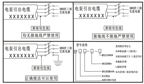 1.引出電纜中一根帶有接地標(biāo)志的黃綠雙色芯必須接地線。如無(wú)固定地線,可用2米金屬棒埋入河湖岸邊,水溝邊或潮濕的土中作地線。