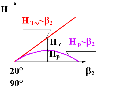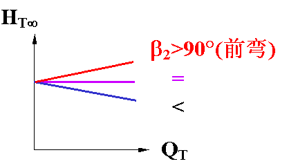 上圖表示了HT∞與QT的線性關(guān)系,斜率隨著β2變,后彎葉片的HT∞--QT的關(guān)系曲線稱為離心泵的“理論特性曲線”。