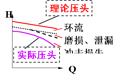 實際生產(chǎn)中,A、葉片時有限的,液體流動時會產(chǎn)生與流動方向不一致的“軸向渦流”→H↓;B、實際流體與葉輪、泵殼等流道上的元件間不可避免的能量損失→H↓;C、泵內(nèi)各種泄漏損失:高壓液體的部分回流、平衡孔的回流液、軸封處的泄漏→Q↓。