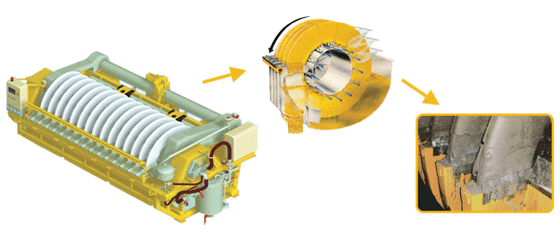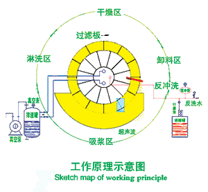 | 工作原理: 吸漿區(qū):工作時(shí)浸沒在料漿的過濾板在毛細(xì)作用下結(jié)合真空壓力,表面吸附成一層濾餅,濾液通過濾板進(jìn)分配閥至排液罐。 淋洗區(qū):濾餅轉(zhuǎn)出料漿斗后,對濾餅進(jìn)行噴淋洗滌。 干燥區(qū):濾餅繼續(xù)在水環(huán)真空泵高真空力的作用下脫水。 卸料區(qū):進(jìn)入無真空的情況下,刮刀自動卸料。 反沖洗:工業(yè)水或?yàn)V液通過分配閥進(jìn)入陶瓷板由內(nèi)向外進(jìn)行清洗。清洗堵塞的微孔。在陶瓷板使用一個(gè)周期后,采用超聲波配合低濃度酸混合清洗,保持陶瓷板的高效使用。 |