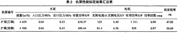 有效功率是水泵傳給水的凈功率。也就是水泵在單位時間內(nèi),給多少重量的水提升了多少高度。水泵效率是有效功率與軸功率之比。效率愈高。表示水泵本身損失的功率愈少。從表2數(shù)據(jù)中可以看出,2泵在開工頻冷水泵時出口壓力0.53MPa、水泵有效功率616.37kW。電機(jī)有用功率1311kW、功率因數(shù)cos<P0.96、機(jī)泵效率47.02%。在變頻狀態(tài)下冷水泵出口壓力調(diào)至供水壓力下限0.43MPa、水泵有效功率486.44kW、電機(jī)有用功率858kW、功率因數(shù)cosq)0.97、機(jī)泵效率56.69%。數(shù)據(jù)說明變頻狀態(tài)下變頻泵在出El壓力降低時。電機(jī)的有用功率有所下降,水泵的有效功率也隨之下降。但電機(jī)電流降低了約40%,同時功率因數(shù)和機(jī)泵效率卻有所上升,表明在滿足供水壓力、流量的前提下。使用變頻泵和工頻泵并聯(lián)運行,可比兩臺工頻泵并聯(lián)運行節(jié)能。見表3。