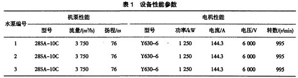 蘭州石化公司動力廠第三循環(huán)水場設(shè)計供水能力為7500m3/h。擔(dān)負(fù)著7套煉化裝置循環(huán)冷卻水的供應(yīng)。流程是從煉化裝置返回的壓力回水經(jīng)DN900線回到循環(huán)水場,沿冷卻塔DN800上水立管上塔,經(jīng)過配水和淋水裝置。進(jìn)行通風(fēng)冷卻。冷卻后的水匯人塔下集水池。再通過聯(lián)通管流人冷水池。循環(huán)水泵房設(shè)置冷水泵三臺。冷水泵從冷水池吸取冷水后加壓外供,沿DN900管線雙路進(jìn)入循環(huán)水管網(wǎng),供生產(chǎn)裝置冷卻使用。按照生產(chǎn)要求供水壓力一般保持在O.4一O.7MPa之間,但在實際運行中發(fā)現(xiàn),由于各煉化裝置開停工時間不一致。造成循環(huán)冷卻水供水壓力忽高忽低,用水量大時冷水泵效率較高,而在開工裝置少時,開兩臺工頻泵運行時壓力過高,出口閥門處于半開狀態(tài)時裝置能耗居高不下。導(dǎo)致冷水泵憋壓甚至引起機(jī)泵振動和發(fā)熱。使供水能耗升高同時容易使供水設(shè)備損壞。究其原因是三臺冷水泵性能相同、供水能力相等,見表1。在用水量小時沒有調(diào)節(jié)手段。在生產(chǎn)用水量不是很大的時候.開一臺冷水泵水壓偏低不能滿足生產(chǎn)要求。開兩臺冷水泵又造成“大馬拉小車”現(xiàn)象。因此為了適應(yīng)煉化生產(chǎn)的變化,降低供水系統(tǒng)能耗,改變供水系統(tǒng)的被動局面,采用高壓變頻器根據(jù)水壓變化控制循環(huán)水泵轉(zhuǎn)速以達(dá)到經(jīng)濟(jì)合理運行的目的。
