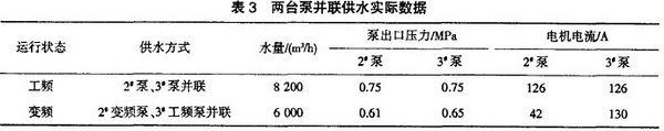 從表3兩臺泵并聯(lián)供水實際數(shù)據(jù)中可以清楚看到在工頻狀態(tài)下。泵出El壓力都超出了正常運行壓力,已致引起機(jī)泵振動和發(fā)熱。而在 泵變頻狀態(tài)下與3#工頻泵并聯(lián)運行時,泵出El壓力有所降低。2變頻泵電機(jī)電流則大幅下降。因此可以得出以下結(jié)論: