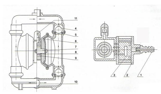 1 進氣口 2 配氣閥體 3 配氣閥 4 圓球 5 球座 6 隔膜 7 連桿 8 連桿銅套 9 中間支架 10 泵進口 11 排氣口