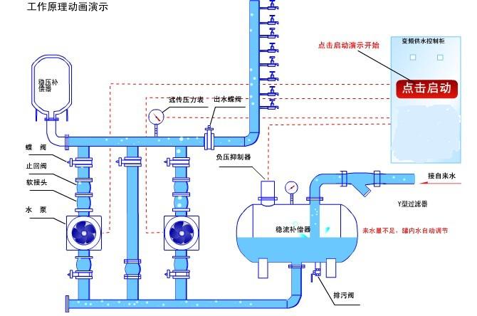 2.變頻泵的進水口與不銹鋼穩(wěn)流補償器相連,微機系統(tǒng)檢查穩(wěn)流補償器內(nèi)的壓力,當壓力降到零壓時,安裝在穩(wěn)流補償器內(nèi)上方外部的真空自動抑制器就會自動打開穩(wěn)流補償器內(nèi)外空氣通道開通,通過進水壓力檢測和真空自動抑制器來保證穩(wěn)流補償器內(nèi)不產(chǎn)生負壓,從而保證自來水管網(wǎng)的正常供水。
