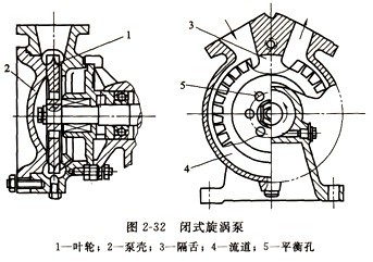 (1)閉式旋渦泵結(jié)構(gòu)閉式旋渦泵結(jié)構(gòu)如圖2-32所示,主要由葉輪、泵體、隔舌組成。圖中流道兩端(或一端)與進(jìn)口或出H相通,稱為開(kāi)式流道。葉輪上開(kāi)有平衡孔,用于平衡軸向力。液流由入口進(jìn)入,在葉輪帶動(dòng)下做縱向旋渦運(yùn)動(dòng)獲得能量,由出口排出,靠近出口側(cè)葉片間液體隨葉輪回到泵入口。