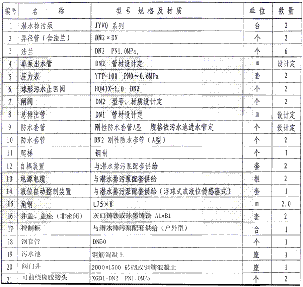 4.潛水排污泵控制柜安裝位置由單項工程設計考慮,其型號規(guī)格可由泵廠配套供應。池外電線電纜應穿管敷設。