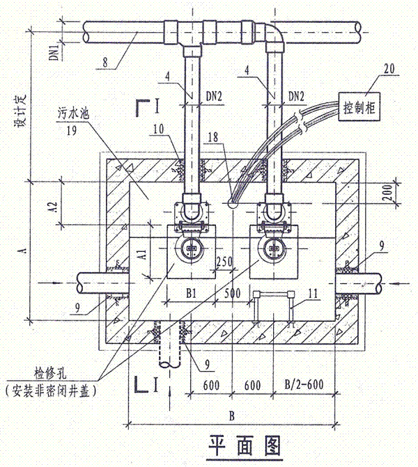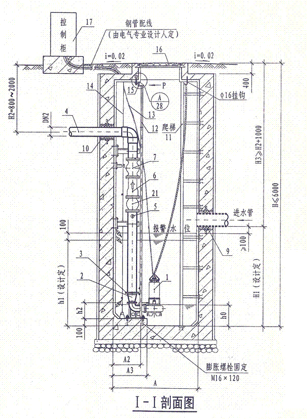 4.潛水排污泵控制柜安裝位置由單項(xiàng)工程設(shè)計(jì)考慮,其型號規(guī)格可由泵廠配套供應(yīng)。池外電線電纜應(yīng)穿管敷設(shè)。