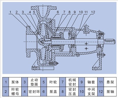 IH型泵是全國(guó)泵行業(yè)采用ISO國(guó)際標(biāo)準(zhǔn)聯(lián)合設(shè)計(jì)的系列產(chǎn)品,其主要由泵體、葉傳輸線、密封環(huán)、葉輪螺母、泵蓋、密封部件、中間支架、軸、懸架部件等組成。