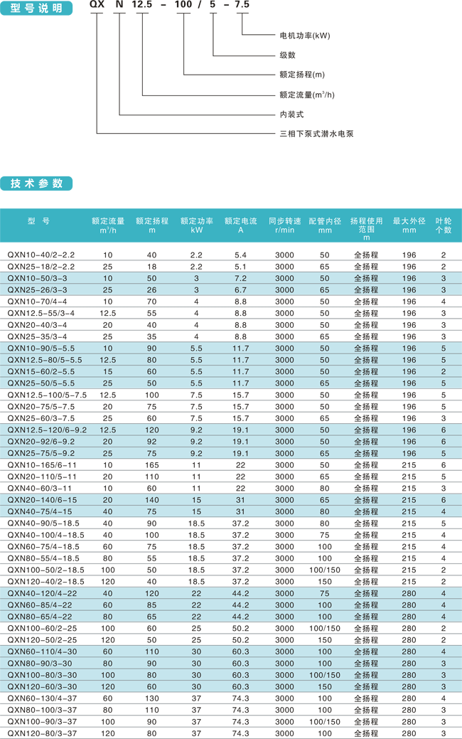 全揚(yáng)程內(nèi)裝式潛水電泵使用條件及性能參數(shù)