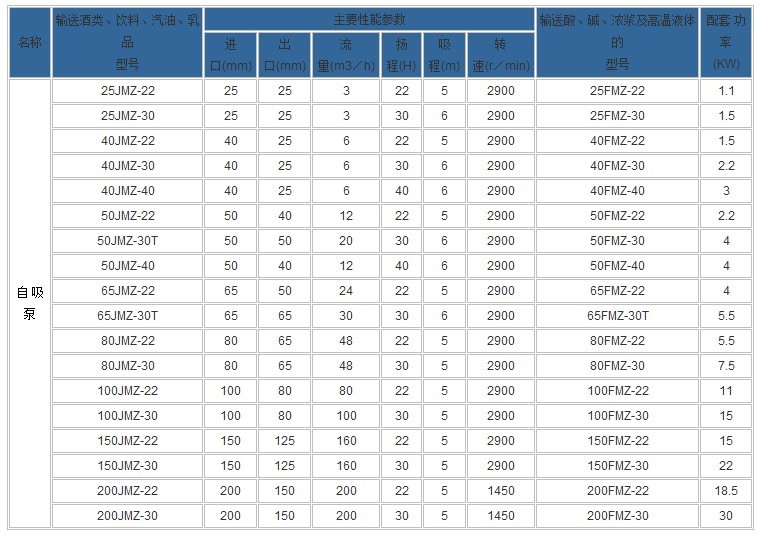 JMZ、FMZ自吸酒泵-自吸化工泵性能參數(shù):