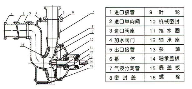 ZW系列自吸無堵塞排污泵,主要由泵體、葉輪、后蓋、機械密封、泵軸、軸承座、進口閥、氣液分離管、加水閥門、進、排接管等組成。泵的結(jié)構(gòu)見下圖。