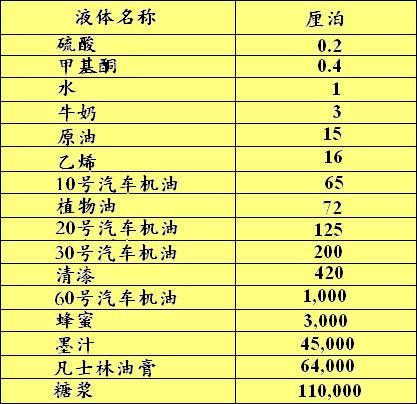 常見物質流體近似粘度表
