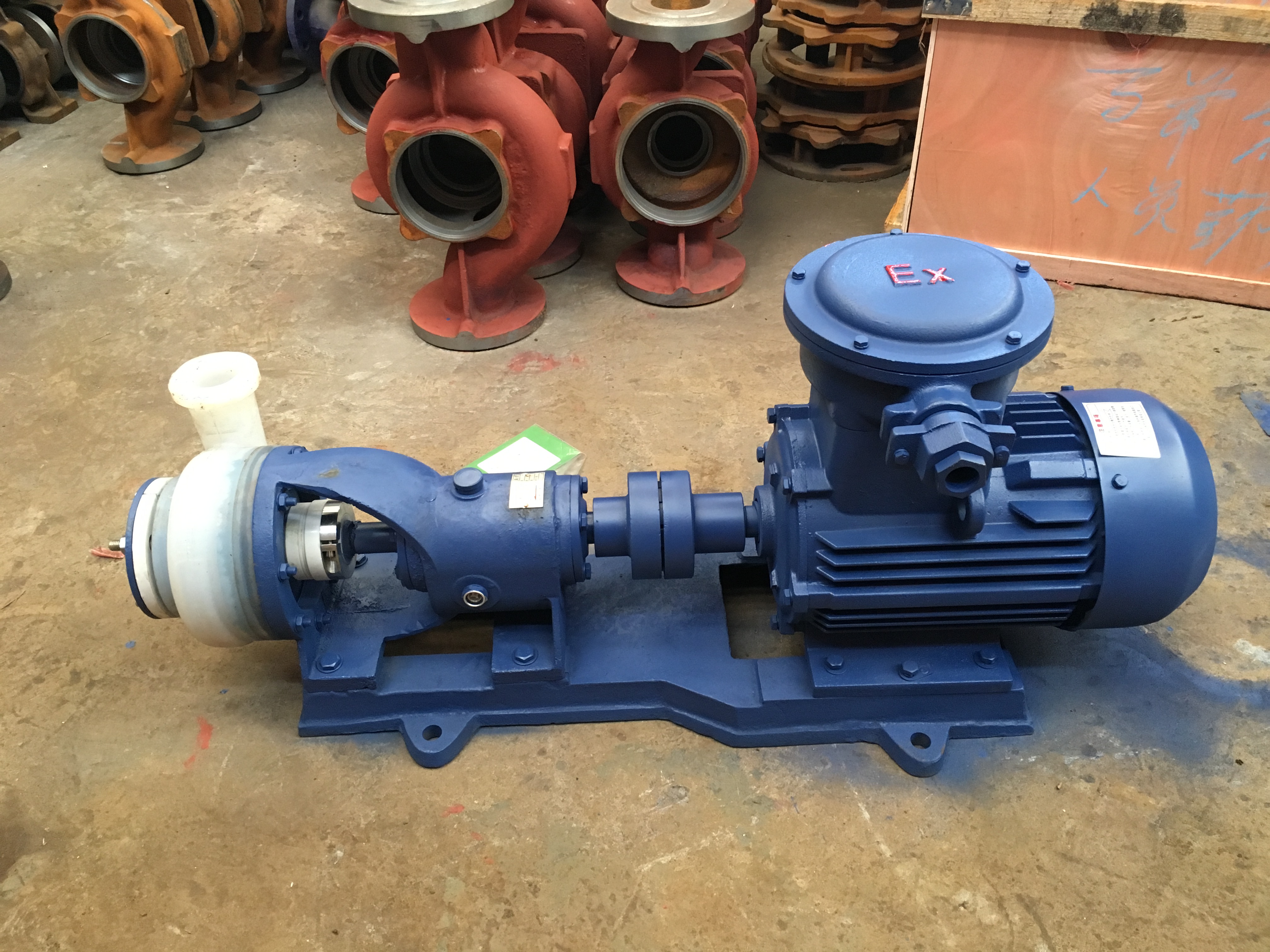 是一種離心式化工泵,其泵頭全部采用氟塑料模制而成,主要材料是高分子材料、F26材質(zhì)、F46材質(zhì) 、氟塑料合金材質(zhì)的。因材質(zhì)不同價格也誤差比較大。此類泵一般用于進出管道口徑要求相對較小,流量揚程要求較低的工礦中輸送化學(xué)流體。因泵頭全部采用氟塑料制造,因此機械強度相對比較弱,易開裂老化,在維修時必須拆卸泵的進出口管道。否則很容易在維修安裝過程中因外力,管道重力而損壞泵體.