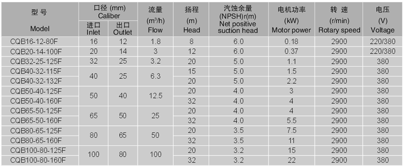 CQB-F型襯氟磁力泵的過流部件均采用“聚偏二氟塑料合金(PVF2)和超高分子量聚乙烯(UHMWPE)”制造。在常溫下,PVF2對鹵素、鹵代烴、強氧化劑、沸酸、堿等多種有機溶劑都有良好耐蝕性;UHMWPE對非氧化性酸(稀硫酸、硝酸及濃度較大的鹽酸、磷酸、氫氟酸、甲酸、乙酸)、氨和胺及各種堿、鹽溶液都有良好的耐蝕性,兩種材料都不耐強氧化性酸的腐蝕。氟合金泵的外殼為金屬材料,有足夠的強度承受管道以及外界的機械沖擊。傳動功率3kW以下的采用全氟結(jié)構(gòu)。