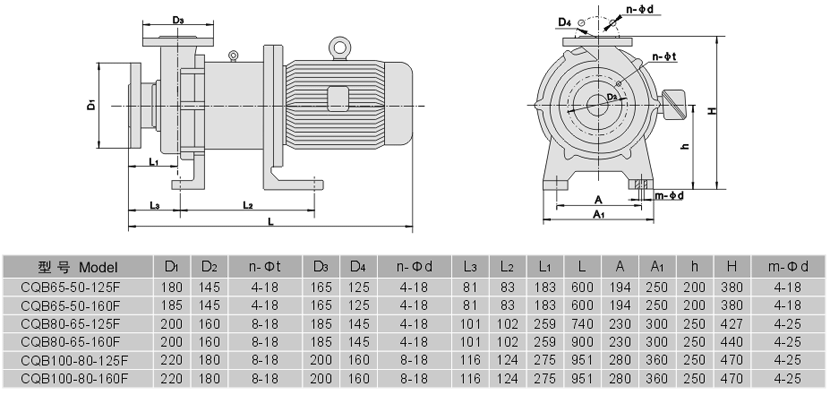 CQB-F系列全氟襯氟磁力泵性能參數(shù)型號意義安裝尺寸