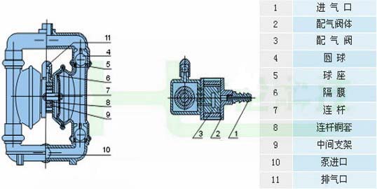 在泵的兩個對稱工作腔中,各裝有一塊有彈性的隔膜,聯(lián)桿將兩塊隔膜結(jié)成一體,壓縮空氣從泵的進氣頭進入配氣閥 后,推動兩個工作腔內(nèi)的隔膜,驅(qū)使聯(lián)桿聯(lián)接的兩塊隔膜同步運動。與此同時,另一工作腔中的氣體則從隔膜的背后排出泵外。一旦到達行程終點。配氣機構(gòu)則自動地將壓縮空氣引入另一個工作腔,推動隔膜朝相反方向運動,這樣就形成了兩個隔膜的同步往復運動。每個工作腔中設置有兩個單向球閥,隔膜的往復運動,造成工作腔內(nèi)容積的改變,迫使兩個單向球閥交替地開啟和關(guān)閉,從而將液體連續(xù)地吸入和排出。![]() |