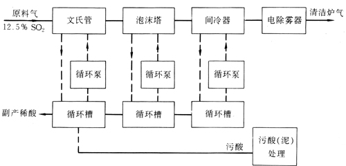 酸洗凈化工藝流程如圖1所示,是利用含H2SO4約10%-30%的稀酸作為循環(huán)吸收液對含有雜質(zhì)的爐氣進行凈化。與水洗凈化相比,其優(yōu)點是可以實現(xiàn)凈化過程中的封閉循拜操作,可以大限度地減少有害物質(zhì)排放,減少環(huán)境污染,還可以副產(chǎn)部分稀酸。