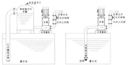 蓄水池吸上引水方式布置的水泵運(yùn)行原理如下右圖,蓄水池一般建于地面以下,而水泵位于地面上,蓄水池水位低于水泵進(jìn)水口,因此,蓄水池內(nèi)的水不能自動(dòng)灌入水泵泵腔,為了使水泵正常工作,在水泵起動(dòng)前必須人工將水灌滿水泵泵腔和水泵吸水管,將泵腔內(nèi)空氣排盡。所以蓄水池內(nèi)水泵的吸水管底端需安裝底閥,但由于市場上一般底閥密封性不是很好,加之水中的顆粒容易進(jìn)入底閥使底閥關(guān)閉不嚴(yán),所以目前采用安裝底閥方式越來越少,大多改為加裝引水罐形式(下左圖),由于加裝了引水罐,不需人工灌引水,且無底閥,使水泵吸水口由負(fù)壓吸水變?yōu)檎龎何�,所以水泵運(yùn)行可靠性要高得多。