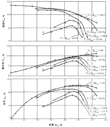 輸送含氣液體時(shí),泵的流量、揚(yáng)程、效率均有所下降,含氣量愈大,下降愈快(見(jiàn)圖
