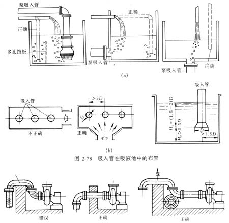 (2)吸液池的進(jìn)液管、回流管、廢液收集管要遠(yuǎn)離泵的吸入管口,以免空氣泡在沒(méi)有消失之前就很快被泵吸入,同時(shí)吸入管不能放在池中央,也不能太靠近池壁(一般離池壁小為1.5D),以免產(chǎn)生旋渦或抽空(見(jiàn)圖2-76)。