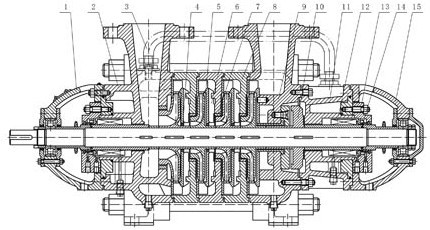 1 軸承體 6 導(dǎo)葉 11 尾蓋 2 進水段 7 密封環(huán) 12 填料密封部件 3 平衡水管 8 中段 13 水冷填料壓蓋 4 導(dǎo)葉套 9 出水段 14 O型密封圈 5 葉輪 10 平衡盤 15 軸承部件