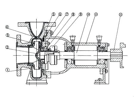 IHF型氟塑料離心泵的泵體材質(zhì)采用金屬外殼內(nèi)襯聚全氟乙丙烯(F46)、葉輪和泵蓋均采用金屬嵌件外包氟塑料整體燒結(jié)壓制成型,軸封采用外裝式波紋管機(jī)械密封,靜環(huán)選用99.9%氧化鋁陶瓷或炭化硅,動(dòng)環(huán)采用四氟填充材料或炭化硅。其特點(diǎn)是該泵結(jié)構(gòu)先進(jìn)合理,耐腐蝕強(qiáng),密封性能嚴(yán)密可靠,工作穩(wěn)定,噪音低,使用壽命長(zhǎng)。