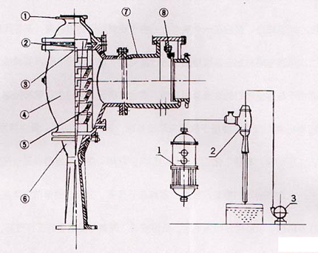 水力噴射器由器體、器蓋、噴咀、噴咀座板、導(dǎo)向盤、擴壓管及單向閥等部件組成,噴咀用不銹鋼制造,噴咀座板由優(yōu)質(zhì)鋼加工,其余零件則系鑄鐵鑄造。噴咀采用多噴咀的結(jié)構(gòu)形式,以便得到較大的水—汽接觸,有利于熱交換的進行,獲得較好的真空效果。噴咀座板加工精密,精度較高,以使噴射水流準確地聚集在同一的焦點。導(dǎo)向盤用于減慢蒸汽(或空氣)的流速,使蒸汽均勻地導(dǎo)入器室以免噴射水流偏斜,降低抽射效能。整個裝置結(jié)構(gòu)緊湊精密,強度高,用于真空蒸發(fā)系統(tǒng)中,由于能把冷凝器的冷凝作用與真空泵的抽氣作用合并在一個設(shè)備中同時完成,大大地簡化了工藝流程,比之原來真空泵加舊式冷凝器的裝置,可以節(jié)省去真空泵、冷凝器、分水器等設(shè)備,并且還有下列優(yōu)點: