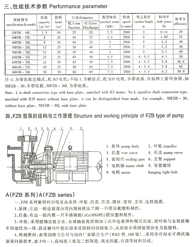 2、FZB系列自吸泵是根據(jù)廣大化工行業(yè)用戶的要求,設(shè)計(jì)的新型氟塑料合成耐腐蝕系列產(chǎn)品,該泵采用外混式自吸結(jié)構(gòu),除首次啟動(dòng)前須向泵體注滿泵體溶液,以后的頻繁啟動(dòng)不需灌注引水或抽排真空,操作方便,安全省事。該產(chǎn)品廣泛適用于化工、石油、制藥、農(nóng)藥、油漆、冶煉、造紙、電鍍、食品等行業(yè)。密封采用英國格蘭盤根公司與國內(nèi)聯(lián)合生產(chǎn)的機(jī)械密封,自試制,生產(chǎn)使用幾年來在市場上享有耐腐蝕之的美名。目前,是杜絕跑、冒、漏、滴建設(shè)文明工廠的理想防腐輸送設(shè)備。