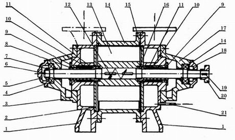 1.端蓋 2.后吸排氣園盤 3.葉輪 4.軸承架 5.園螺母 6.后軸承壓蓋 7.軸 8.軸承 9. 后軸套10.填料壓圈 11.填料 12.填料壓圈 13.平鍵 14.泵體 15.連通管 16.前吸排氣園盤 17.前軸套 18.聯(lián)軸器具 19.平鍵 20.園螺母 21.前軸承壓蓋