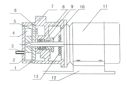 1、圓盤 2、泵蓋 3、進(jìn)水管 4、葉輪 5、橡膠球 6、擋板 7、泵體 8、封液環(huán) 9、填料 10、填料壓蓋 11、電機(jī) 12、底盤 13、擋水圈